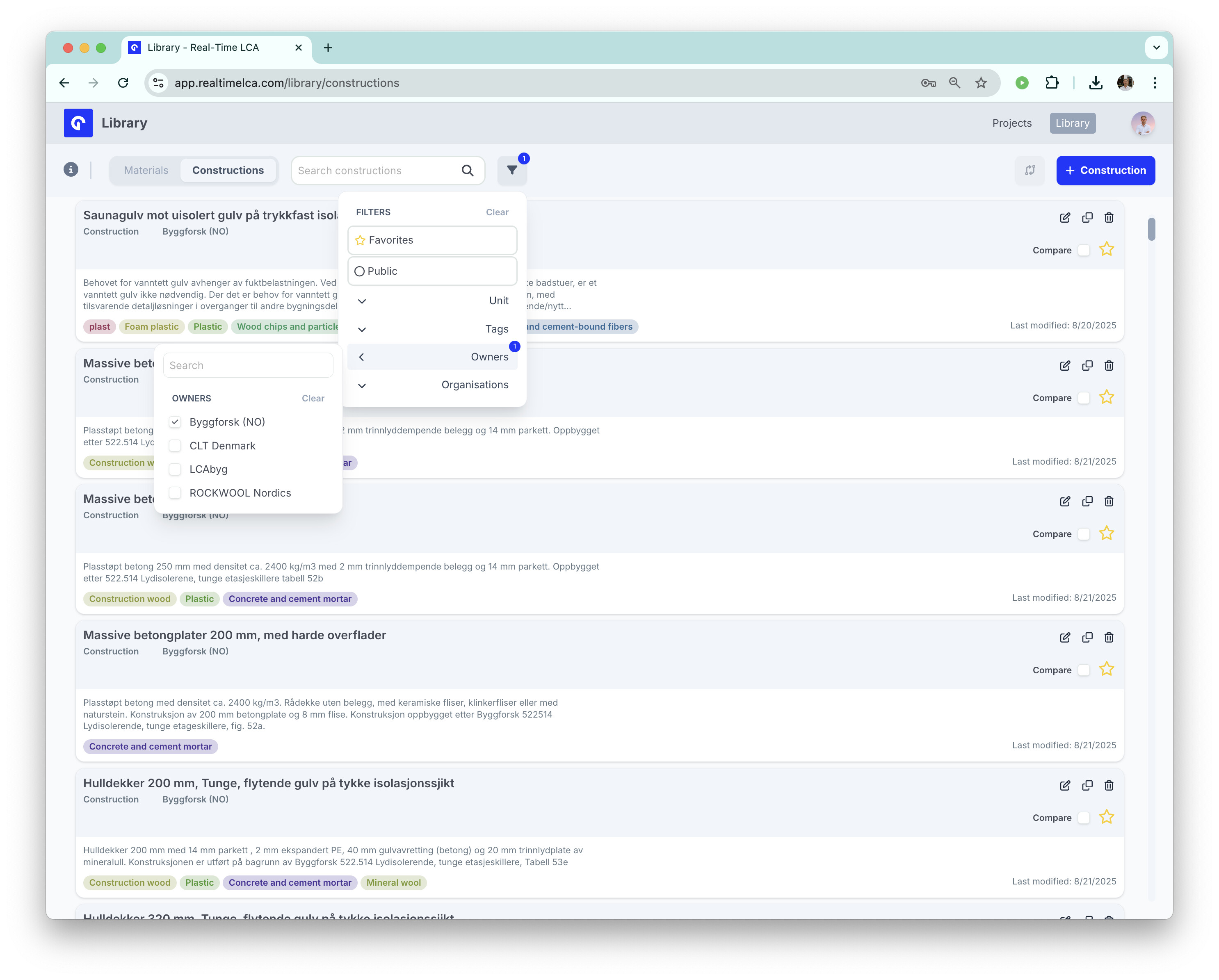 +200 Constructions from Byggforsk.no: Added to the Construction Library—find them via the new Owner filter.